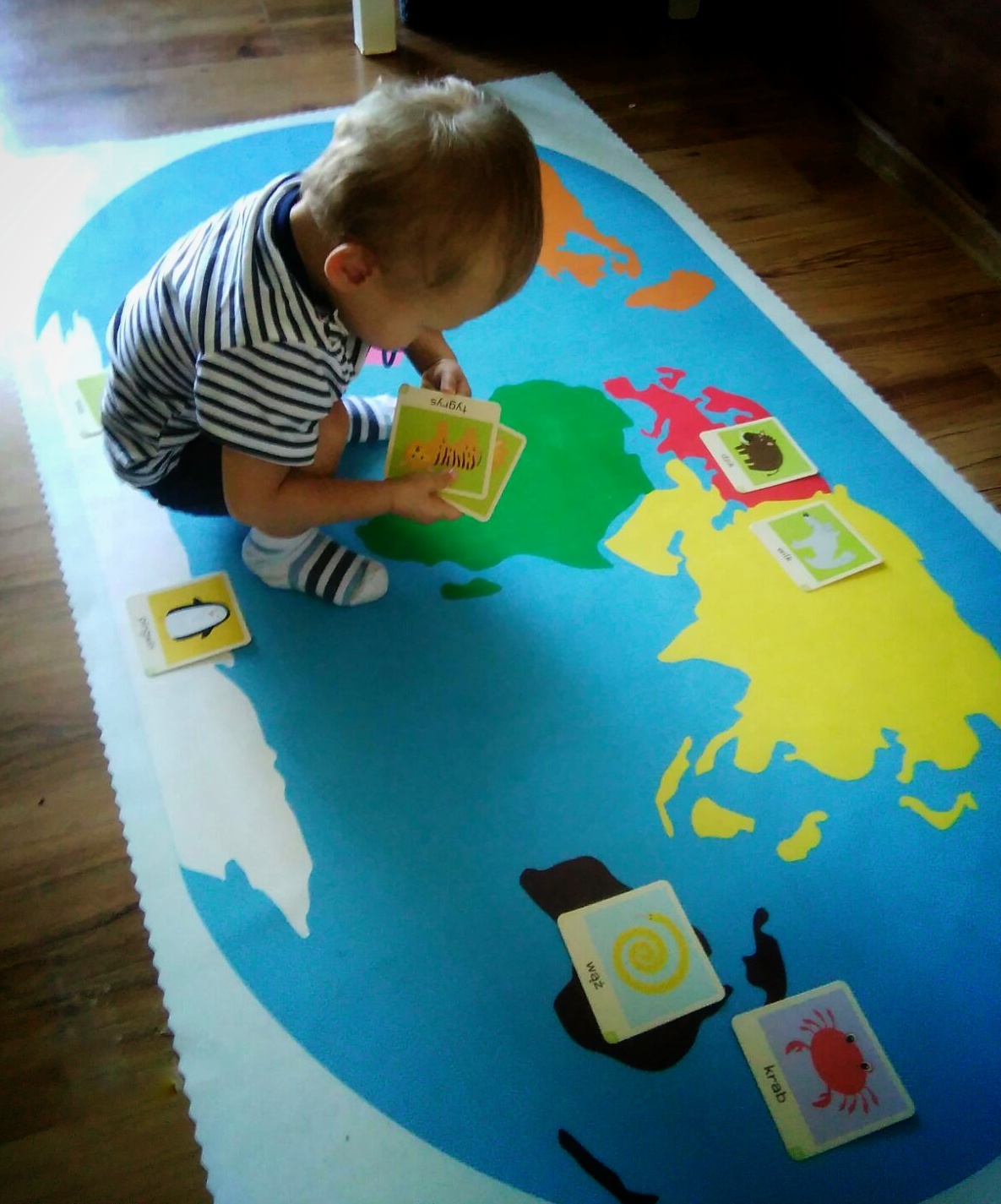 przyporządkowując je do odpowiednich kontynentów, ale również ćwiczymy globalne czytanie . Często też służy jako dywanik na którym uwielbiają spędzać czas.